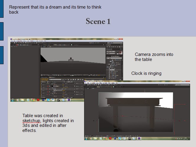 start off with the 3d scene . music kicks in, i chose to make this black and white so that there was a linked atmosphere. it helps the scene create the feel, and mood.